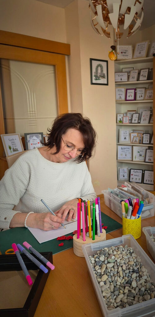 Mein Name ist Sabine Lugauer, ich wohne im schönen Waldviertel und meine Leidenschaft gilt meinen Steinbildern. Schon immer habe ich gerne geschrieben und viele verschiedene Schriftarten ausprobiert. Alle meine Bilder entstehen aus